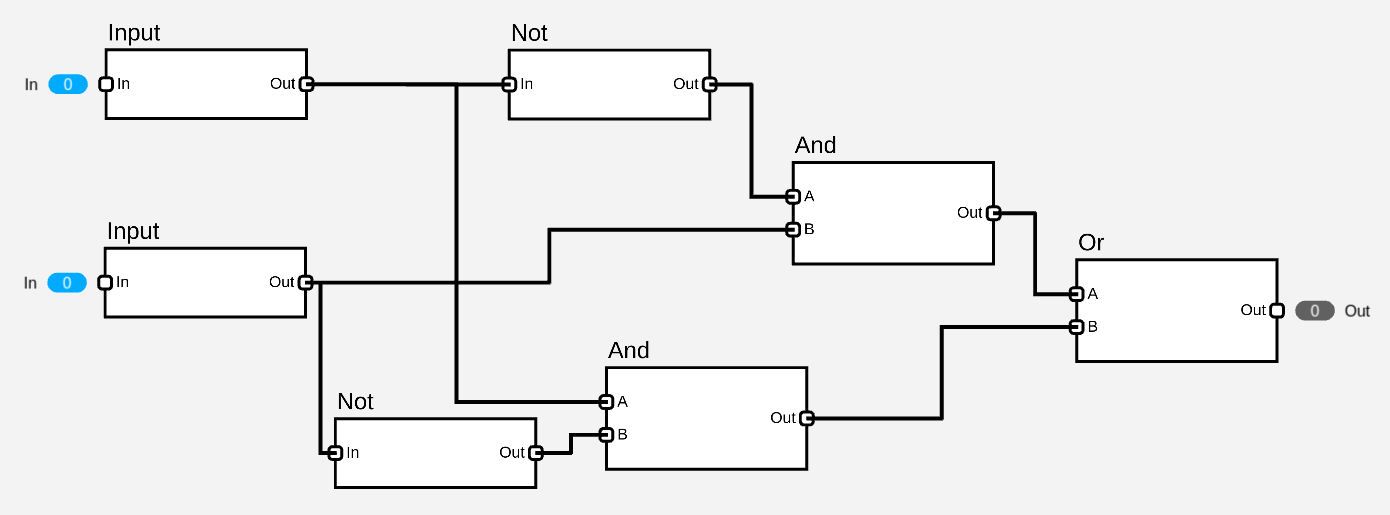 次に、AndとOrとNotを用いて、Xor回路を作ってみましょう。