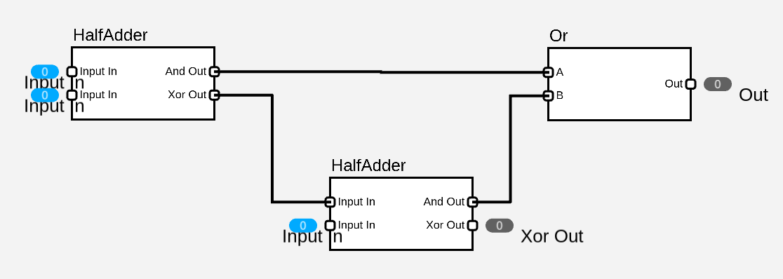 次に全加算器を作ります。全加算器とは、半加算器に、前の桁の繰り上がりを入力出来るようにしたものです。半加算器と同様に、全加算器もFullAdderコンポーネントを作ります。